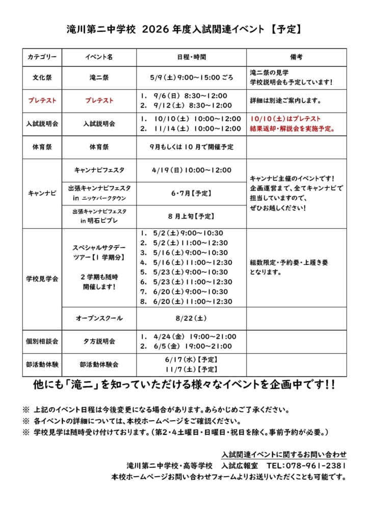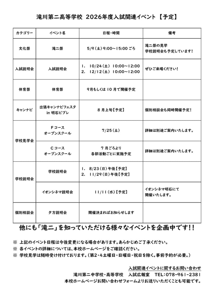 少しでも多くの方に「滝二」の魅力を感じていただきたく、様々な形式の学校紹介イベント・説明会を実施する予定です。ぜひ、一度「滝二」へお越しの上、学校や生徒の雰囲気など、「滝二」ならではの空気感をぜひ感じていただければ幸いです。